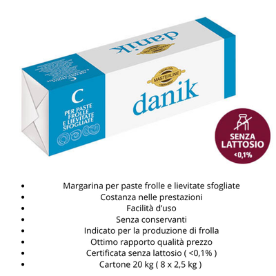 La consistenza morbida unita alla buona pasticità sono le qualità prinicipali di Danik C e la rendono particolarmente indicata per l’utilizzo nelle lavorazioni di pasta frolla e pasta lievitata sfogliata.