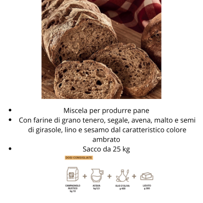 Campagnolo Rustico è un semilavorato per produrre pane con farine di 4 cereali ( grano, segale, avena e orzo) e 3 differenti semi (semi di girasole, semi di sesamo e semi di lino) dal caratteristico colore ambrato e dall'invitante profumo. Miscela per produrre pane con farine di grano tenero, segale, avena, malto e semi di girasole, lino e sesamo dal caratteristico colore ambrato e dall’invitante profumo.