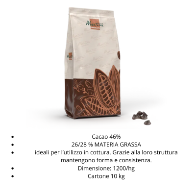 Goccine di cioccolato fondente ideale l'utilizzo per la decorazione di biscotti e di cakes, per la farcitura di cakes e per la farcitura di prodotti lievitati