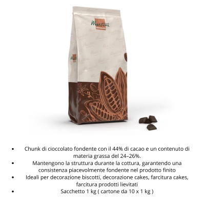 Chunks al cioccolato fondente ideale l'utilizzo per la decorazione di biscotti e di cakes, per la farcitura di cakes e di prodotti lievitati
