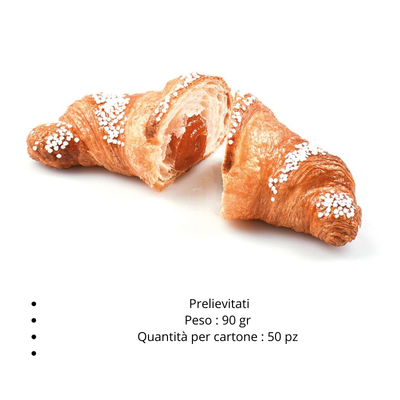 Cornetto curvo, farcito all'albicocca, prelievitato e surgelato, con topping di coriandoli di zucchero bianco