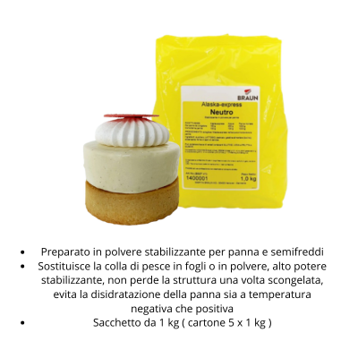 Preparato in polvere stabilizzante per panna vaccina, per mousse, torte di panna e semifreddi.